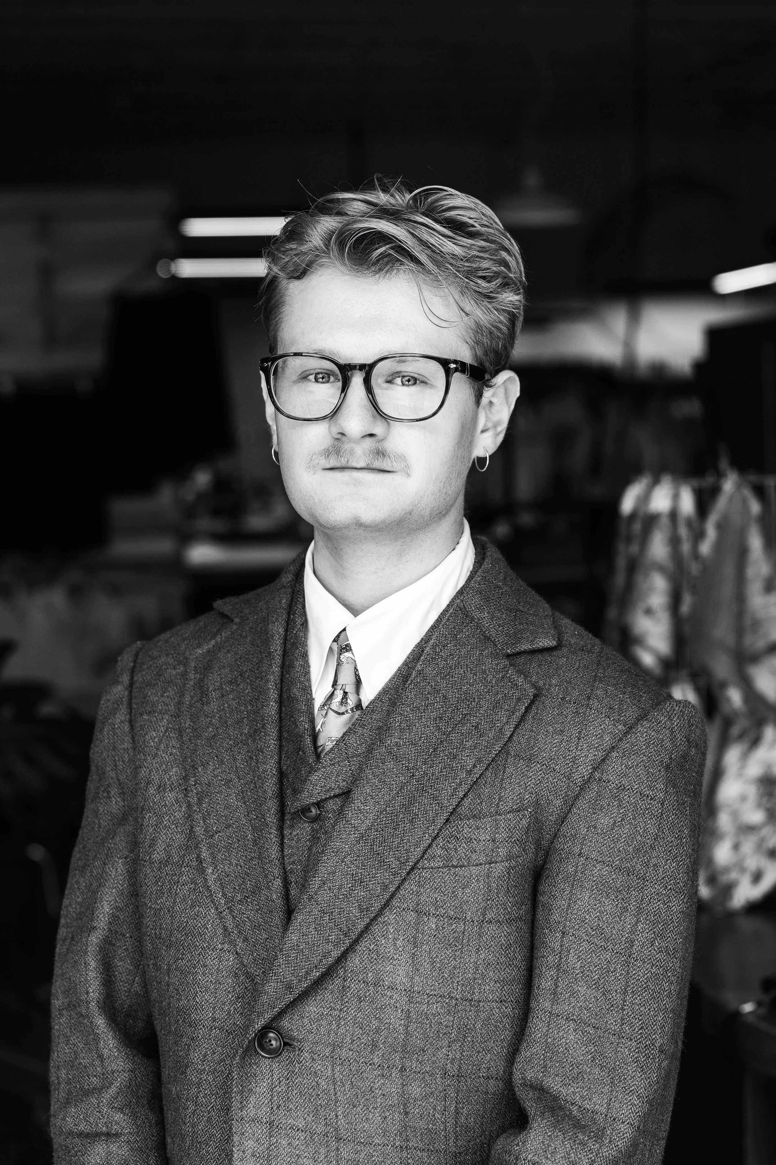 Tom Symonds is an apprentice tailor starting his cutting journey. Tom arrived at the shop in early 2021 with a passion for garment making and learning, and has been with us ever since. With a strong interest in British tailoring, Symonds enjoys merging formal garments and workwear. He is developing his skills on the complex denim-specific machines in the shop while becoming well versed in the deep catalogue of denim textiles and workwear style details. Through Symonds’s apprenticeship, he has been perfecting his hand sewing skills while also learning how to mend garments in a creative and aesthetically pleasing fashion.
