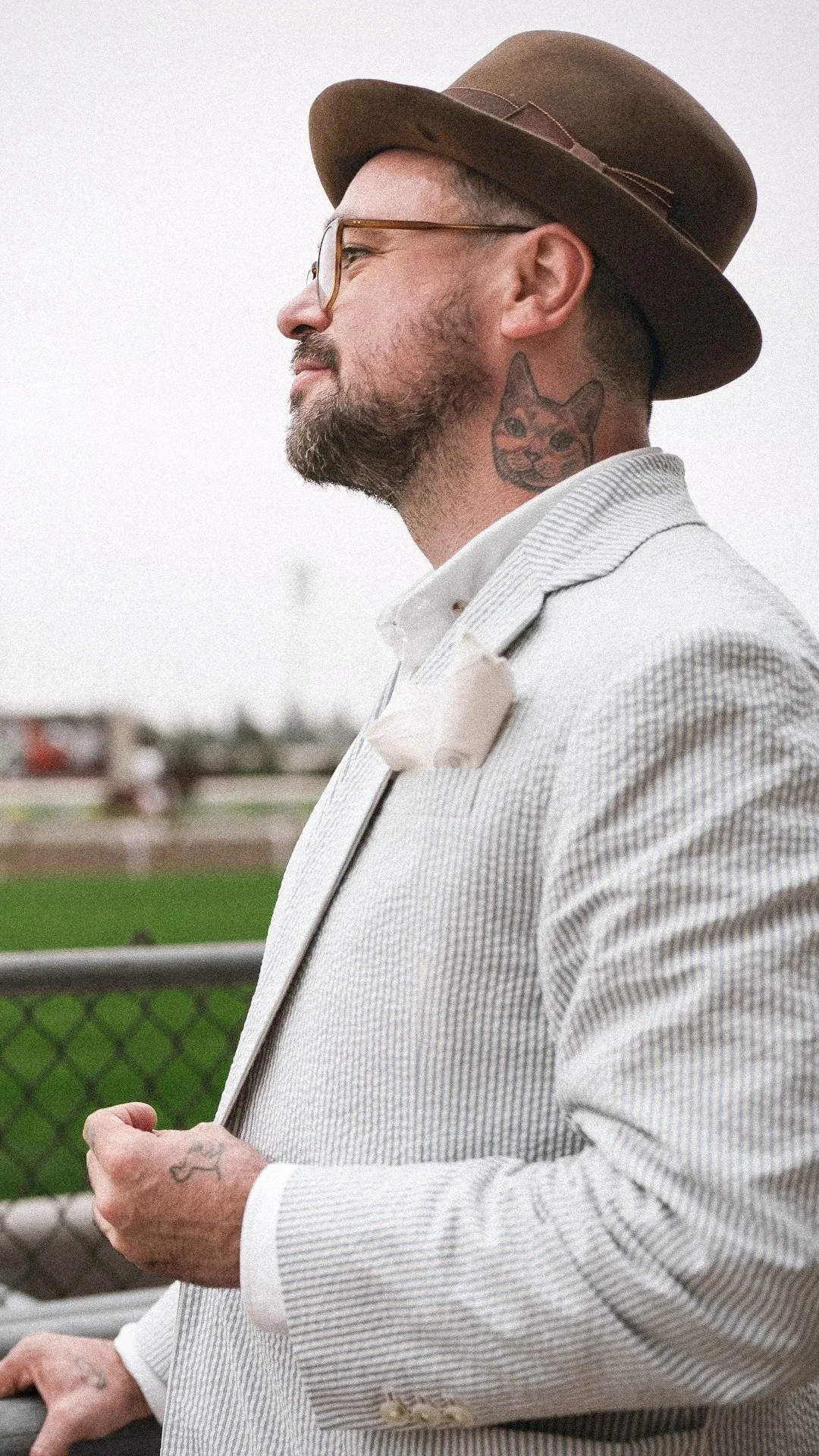Brandon came to us asking what we would prefer to make for him, giving our shop full creative freedom, we came up with this mid-century modern Norfolk suit. Featuring sunburst pleats, a half belt on the back, house style inverted box pleated trousers, handmade buttonholes, and of course, meticulous plaid matching.