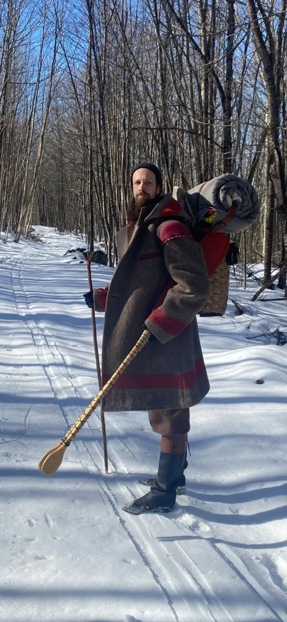 Blanket Coats are as Canadian as they get. These simpler, long, wrapped coats – usually with a hood – are, you guessed it, made from blankets. We have created a fair number of them including the one pictured here that Craig made for himself from a vintage Swiss army blanket.