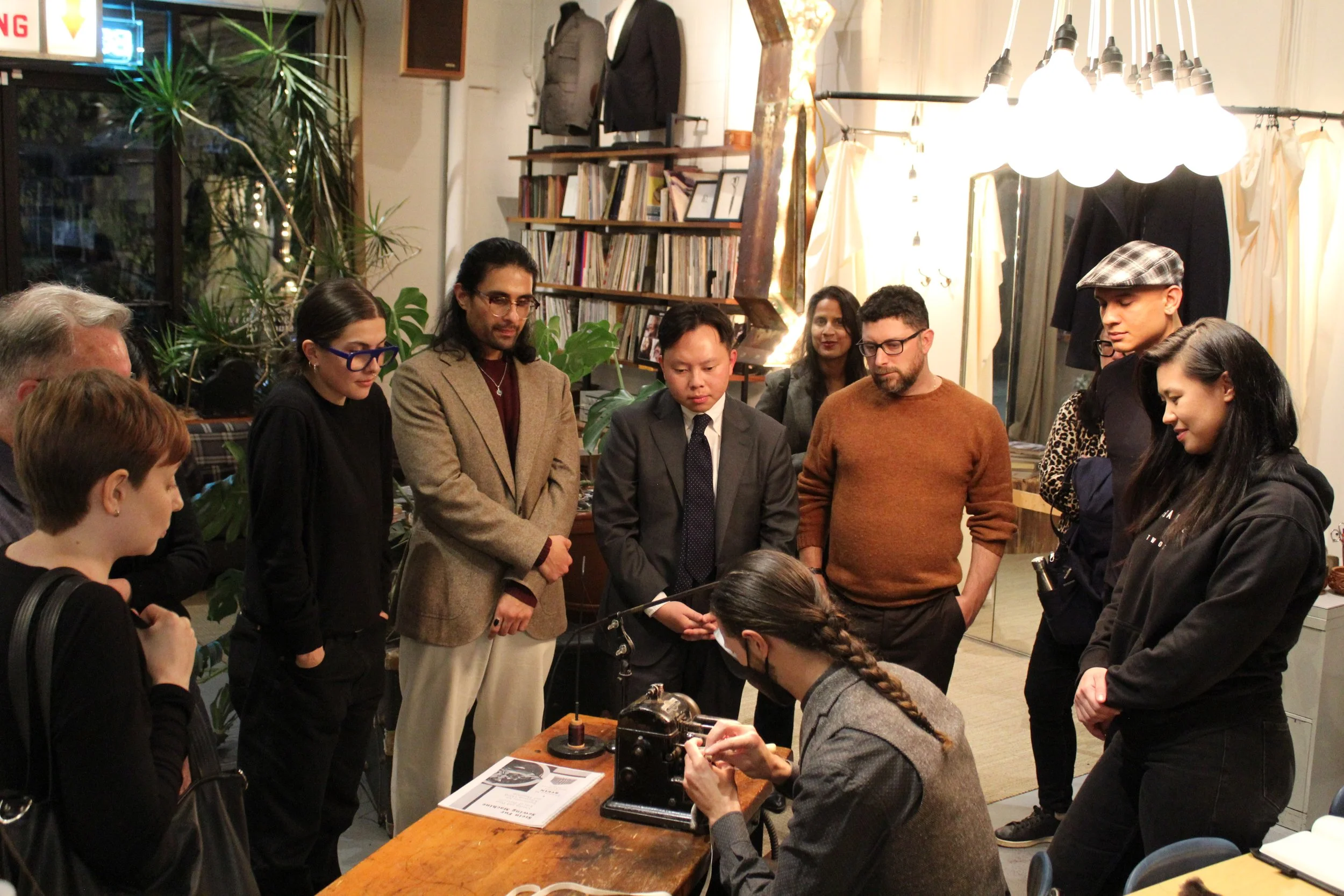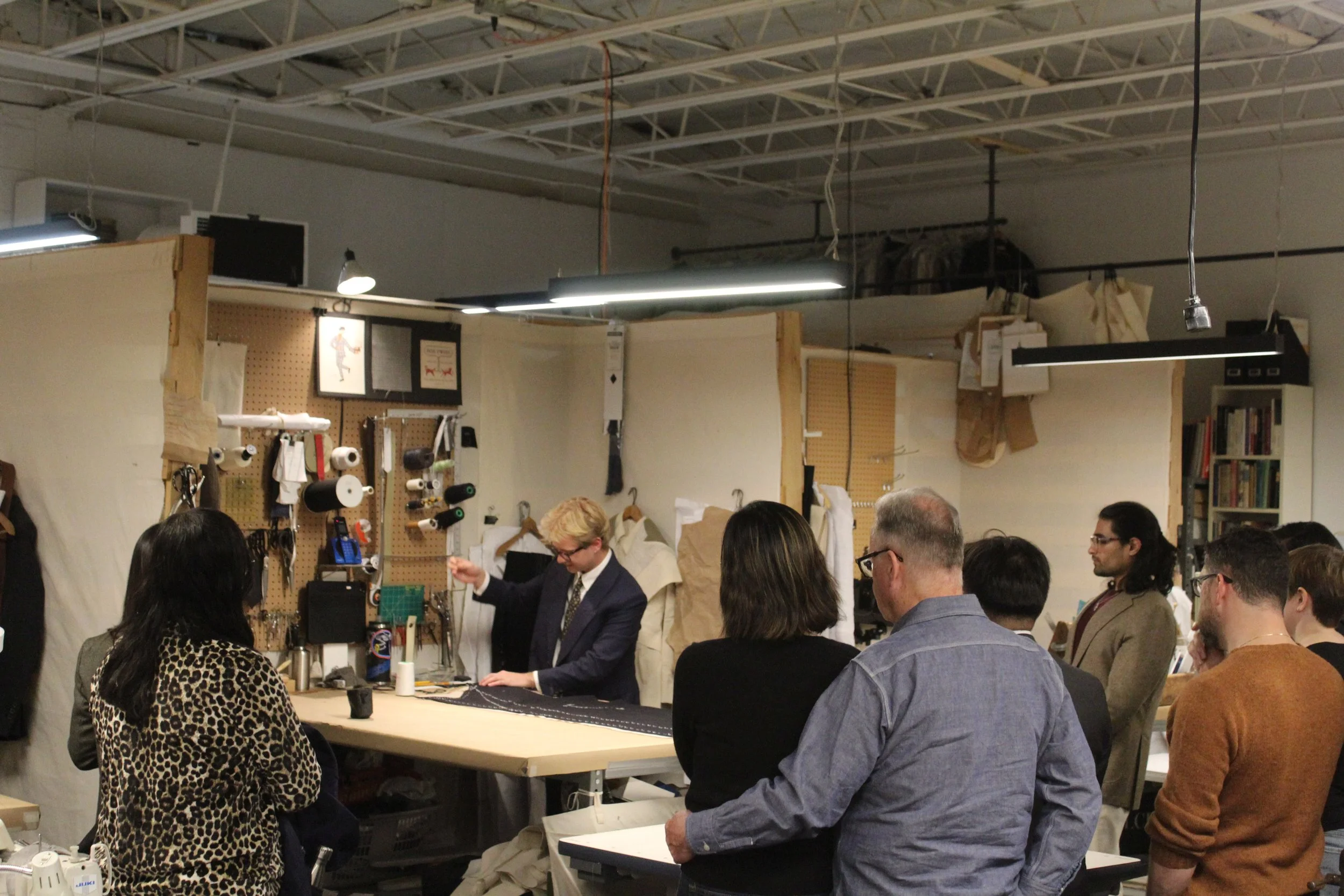Tom delivered a great demonstration of how a canvas is basted into a coat front and we discussed the variety of weights of canvas that can be used to increase or decrease the weight of an overcoat. We talked about the Canadian-made, flannel-backed Kasha linings that we add to coats for extra warmth, about flannel lined pockets and suede backed liners that keep the wind off your kidneys.