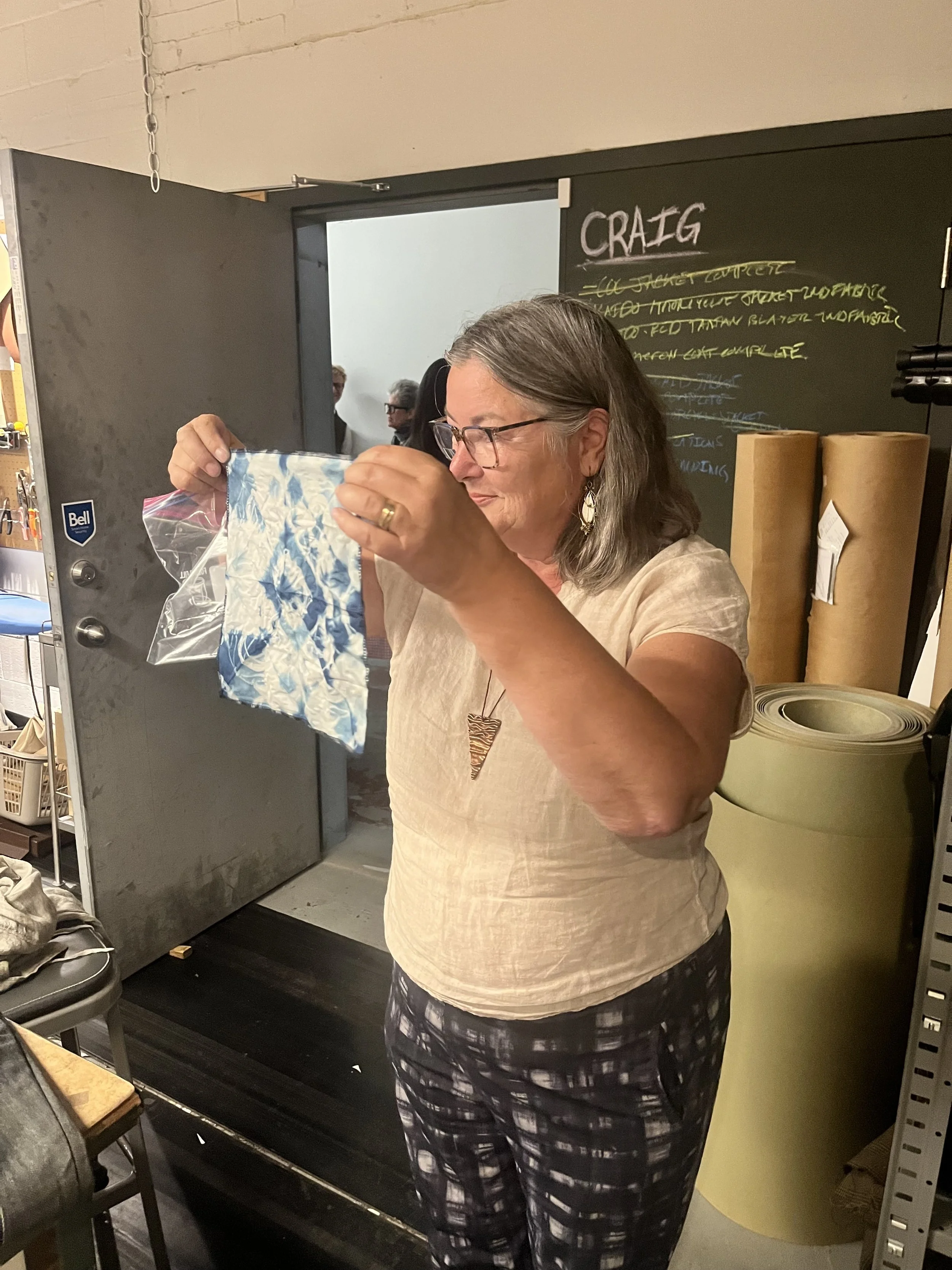 Gitte showing off the pocket square she dyed in indigo during our workshop.