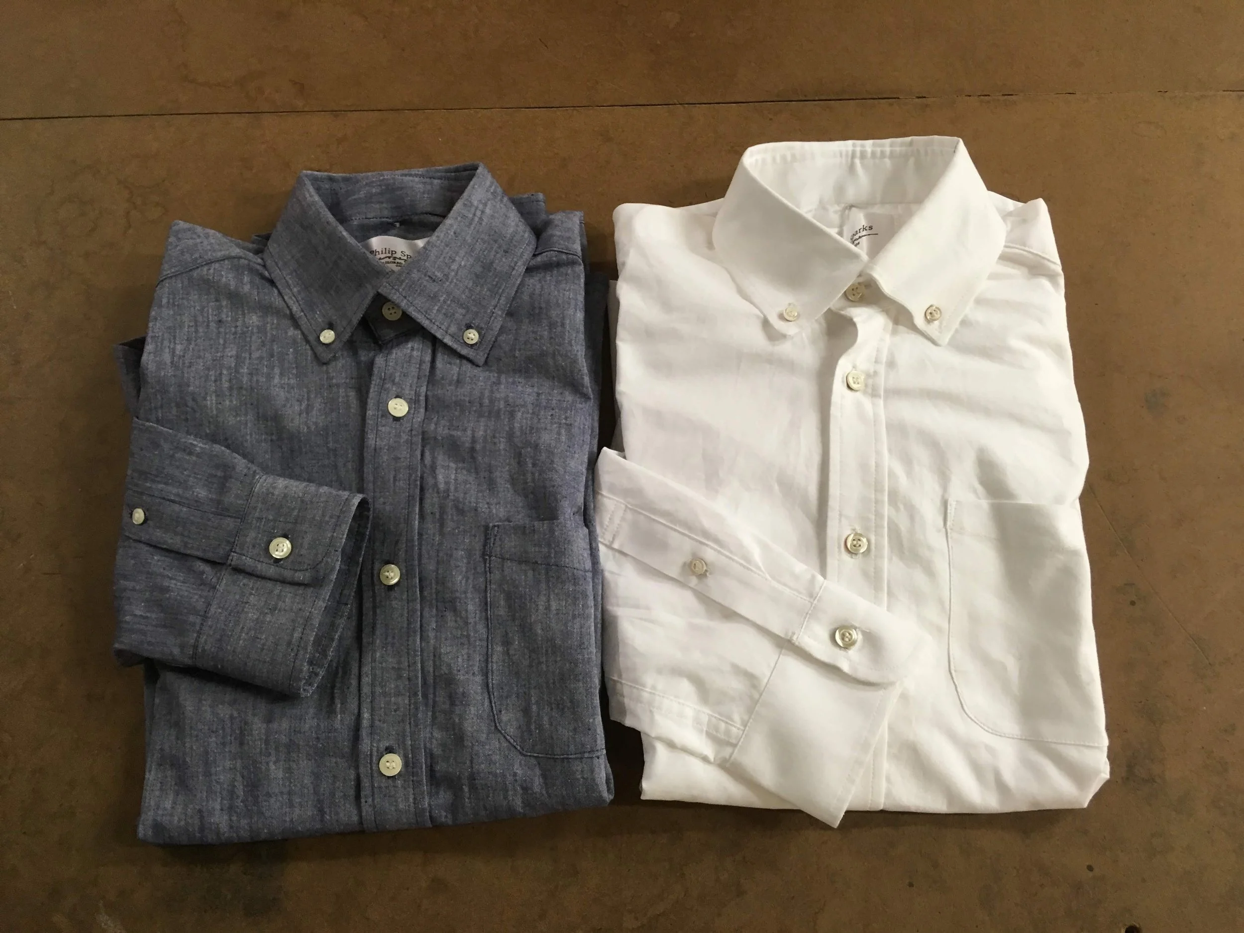 A pair of “oxford” shirts with the shirt on the left being made with a chambray and the shirt on the right being made with an oxford cloth