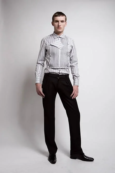 A take on a bib front pleated tuxedo shirt by Philip Sparks for the collection "White Collar Criminal, Fall 2008”